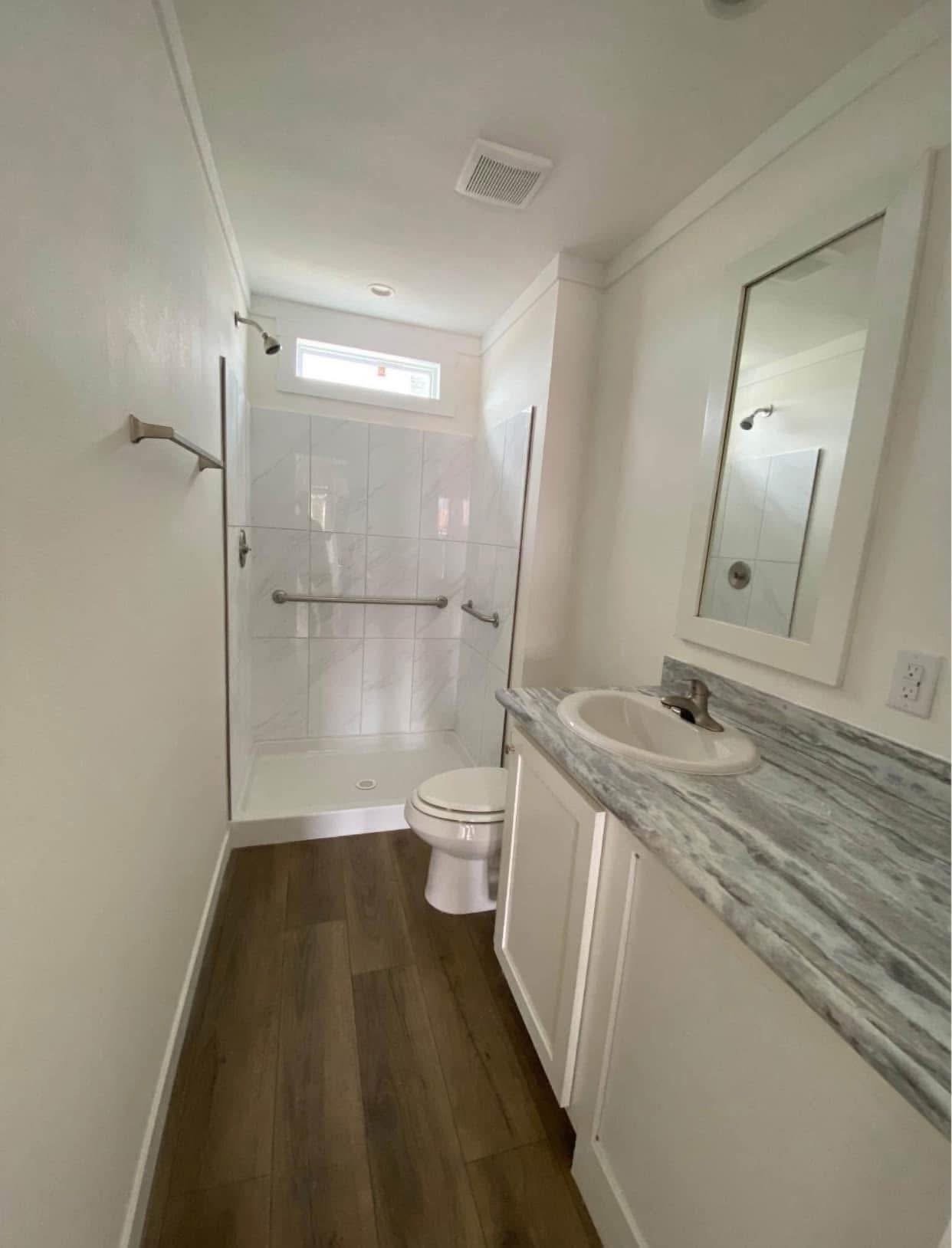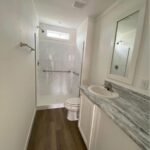β’ tile shower with grab bars for added safety and convenience.